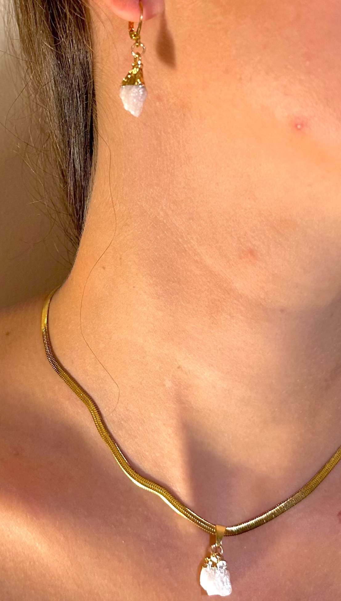 Indossare collana e orecchini insieme crea una luce morbida, sottile, che accompagna senza spingere.